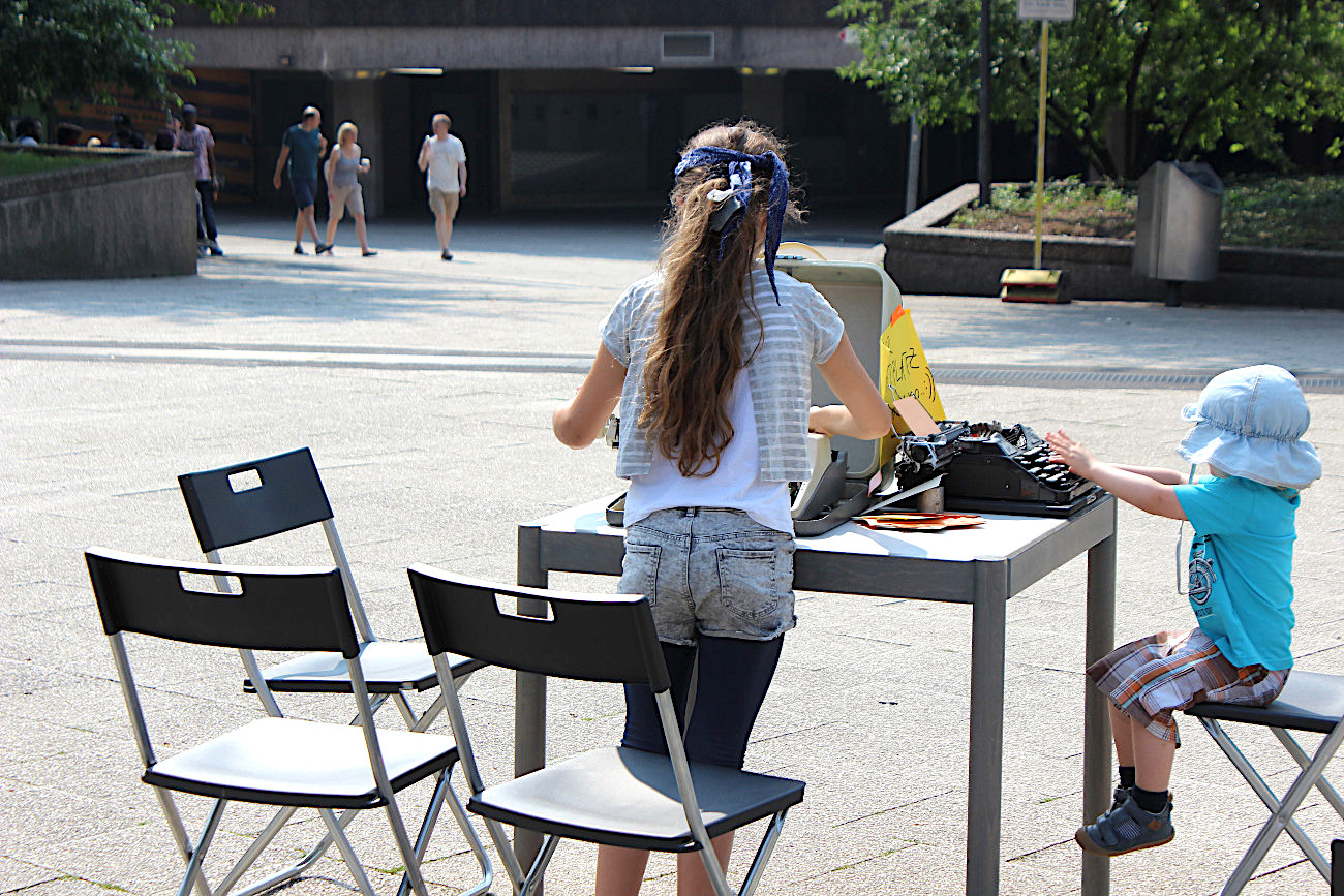 Neben der Möglichkeit Postkarten zu gestalten, konnten kreative Köpfe und Bastelfans auf einer Schreibmaschine auch kleine Briefe an den Ebertplatz verfassen. Zudem lud eine Spieleecke zum Bewegen ein, im „Café“ konnten in gemütlicher Atmosphäre Teilchen verzehrt werden. Die neuen Liegestühle wurden begeistert zum Eisessen und Verweilen eingenommen.