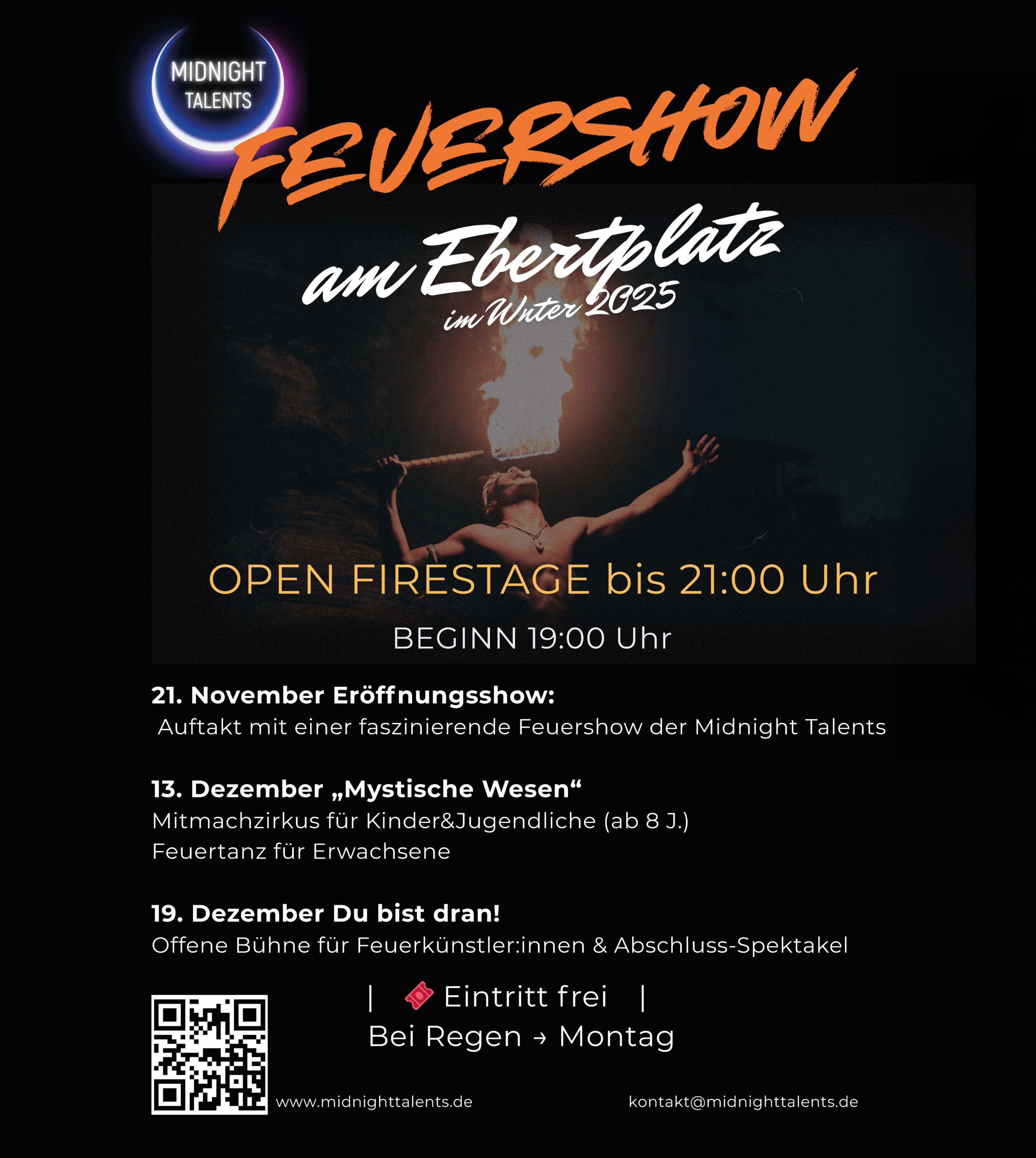Die erste von drei Feuershows am Ebertplatz in diesem Winter! Gemeinsam mit den MidnightTalents verwandelt sich der Platz zwei Stundne lang in einer offene Bühne für Feuerkünstler*innen.