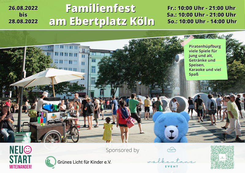 Der Verein „Grünes Licht für Kinder e.V.“ organisiert am Ebertplatz ein Familienfest unter dem Motto „NEUSTART MITEINANDER“, welches am Freitag um 10 Uhr beginnt. Es gibt viele unterschiedliche Attraktionen für die ganze Familie, die alle kostenlos sind. So gibt es eine Hüpfburg, die Möglichkeit Karaoke zu singen und am Samstag gibt es zudem einen kleinen Wettbewerb (Bungee Run) von 12 bis 17 Uhr.